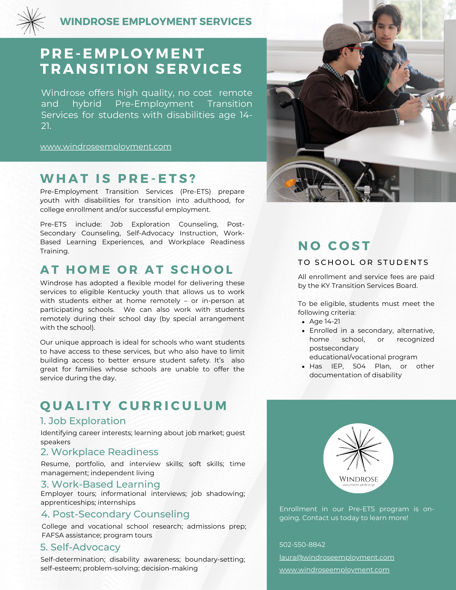 Windrose is proud to offer Pre-Employment Transition Services (Pre-ETS) for students in Kentucky. We are able to provide this service in both individual and group settings.