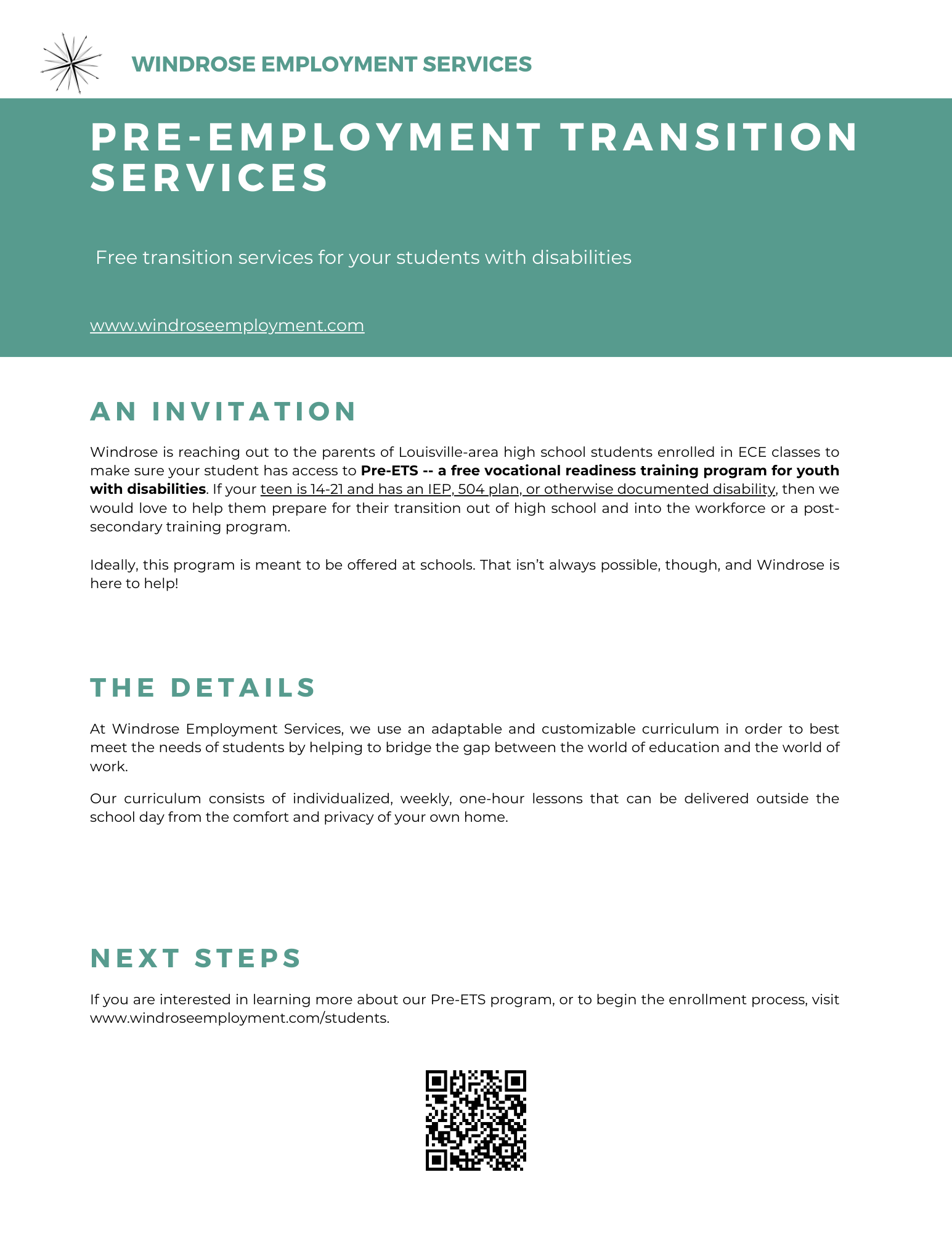 Windrose is currently helping qualified students enroll in our 2025-2026 Pre-ETS program. We need to gather some information in order to register your child to our for this service. Please submit this form to begin the process.
